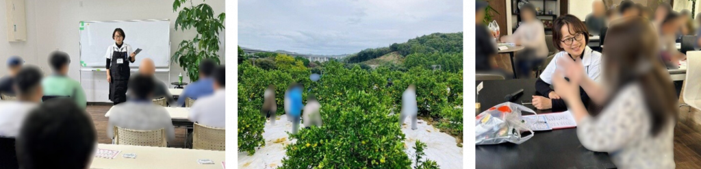 その後は観光バスで自然豊かな農場へ向かい、みかんの収穫体験を実施。チーム戦のゲームも交えながら交流を深め、参加者の笑顔が絶えない時間となりました。十分に打ち解けた後には個別トークを行いました。